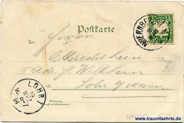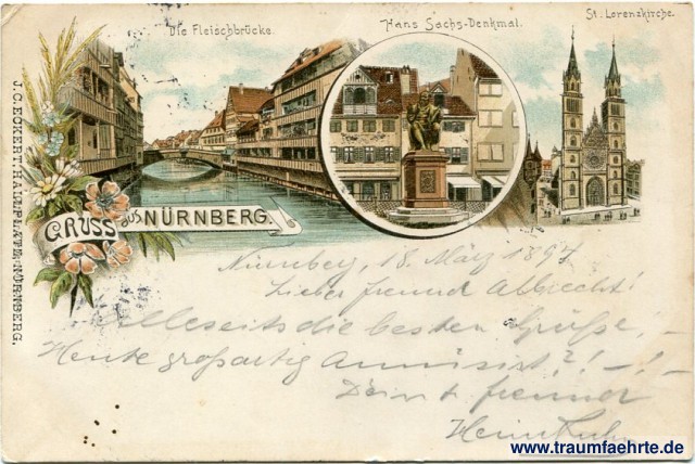 – Details – Year: ca. 1890 Postal state: postally used 1894 Inscription front: Gruss aus Nürnberg, Die Fleischbrücke, Hans Sachs-Denkmal. St. Lorenzkirche. J. C. Eckert. Hallplatz, Nürnberg. Ottmar Zieher, München. Inscription back: Postkarte, An ... in ... Wohnung (Straße und Hausnummer) ... Postmark(s): Nuernberg, 18 Mar [...]; Lohr I, 19 Mrz. 94, Vor 6-7 Please note: