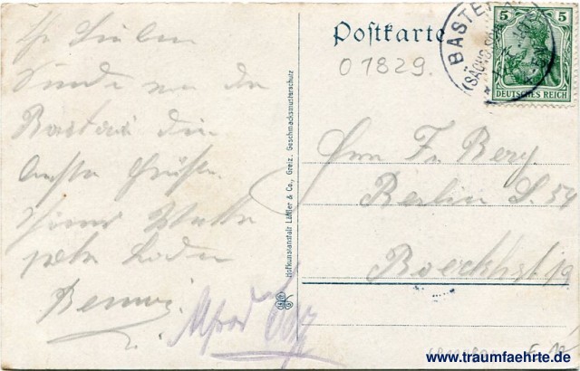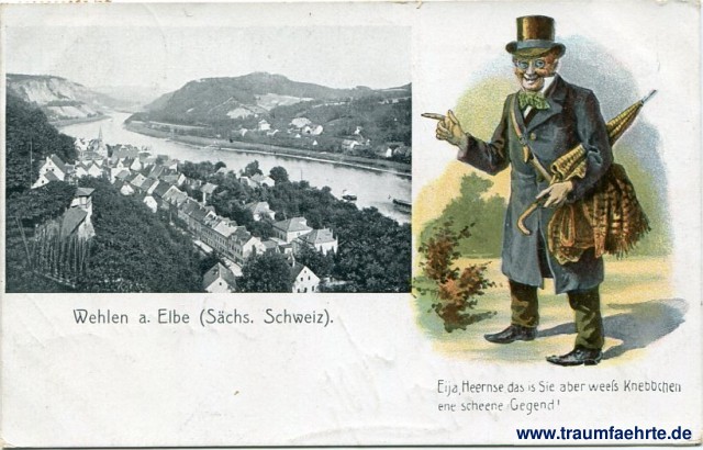 – Details – Year: ca. 1905 Postal state: postally used 1910 Inscription front: Wehlen a. Elbe (Sächs. Schweiz). Eija, Heernse das is Sie aber weess Knebbchen ene scheene Gegend! Inscription back: Postkarte, L & Co. G, Hofkunstanstalt Löffler & Co., Greiz. Geschmacksmusterschutz Postmark(s): Bastei (Sächs. Schweiz), 11.7.10, 4-5N Please note: