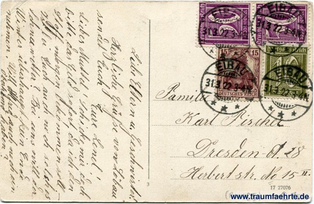 – Details – Jahr: ca. 1920 Status: gelaufen 1922 Beschriftung vorne: Löbau, Königs-Platz Beschriftung hinten: 17 27076 Stempel: 4x Eibau, ***, 31.3.22. 3-4N Hinweis: