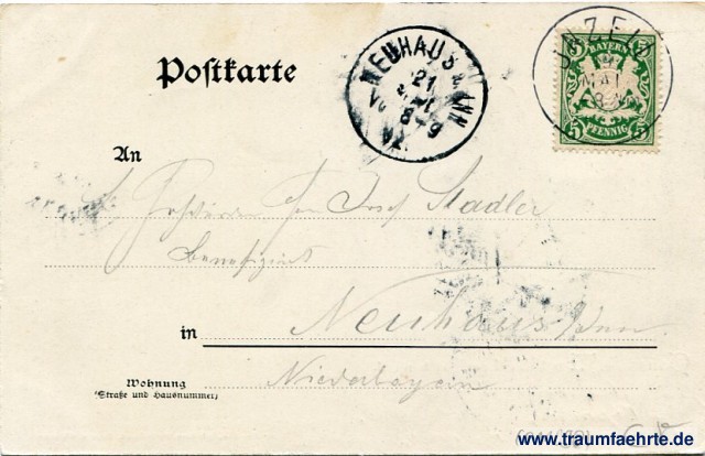 – Details – Year: ca. 1900 Postal state: postally used 1902 Inscription front: Gruss aus Mauthäusl bei Reichenhall, 234, O. Blaschke, kgl. bayr. Hoflieferant, Prien a. Chiemsee. Inscription back: Postkarte, An ... in ... Wohnung (Straße und Hausnummer) ... Postmark(s): Inzell, 19 Mai [...] -8 Nm.; Neuhaus a. Inn, 21 [...] 02, Vor 8-9 Please note: