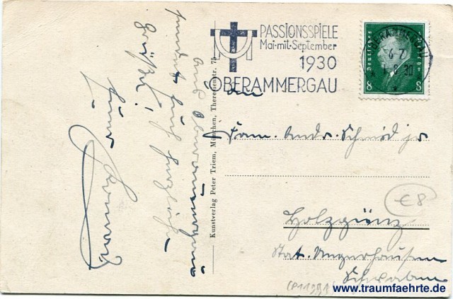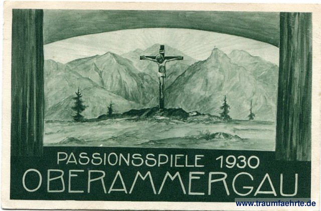 – Details – Year: 1930 Postal state: postally used 1930 Inscription front: Passionsspiele 1930, Oberammergau Inscription back: Kunstverlag Peter Triem, München, Theresienstr. 75 Postmark(s): Passionsspiele Mai mit September 1930, Oberammergau; * * *, Oberammergau, 6-7, 1 8 30 Please note: