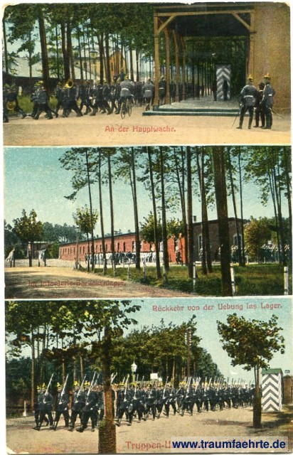 farbig mit drei Ansichten – 1.) Wache mit Wachhäuschen, Soldaten mit Pickelhauben und Fahrrad, Allee, 2.) Baracke mit Soldaten, Bäume im Vordergrund, 3.) marschierende Soldaten mit Gewehren und Pickelhauben, Laterne und Bäume