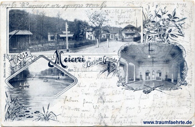 – Details – Year: ca. 1900 Postal state: postally used 1901 Inscription front: Gruss aus der Meierei im Lössnitz-Grunde den ..., Druckerei Glöss, Dresden. Inscription back: Deutsche Reichspost. Postkarte. An ... in ... Wohnung (Straße und Hausnummer) ... Postmark(s): Kötzschenbroda, * [...] *, -9.5.01.11-12V.; Rie[...] Please note: