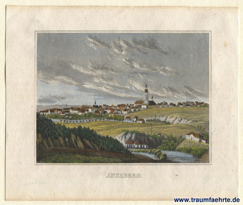 Original: kolorierter Stahlstich – Panorama von Annaberg mit Kirche, Fluss Sehma im Vordergrund