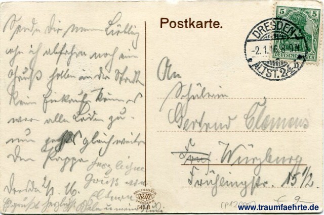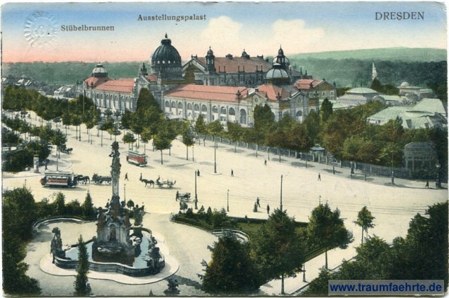 – Details – Jahr: ca. 1915 Status: gelaufen 1916 Beschriftung vorne: Dresden, Ausstellungspalast, Stübelbrünnen Beschriftung hinten: Postkarte. Krille & Martin K & M Dresden-A, 543 B Stempel: Dresden-Altst. 24, b, -2. 1.16.8-9N Hinweis: