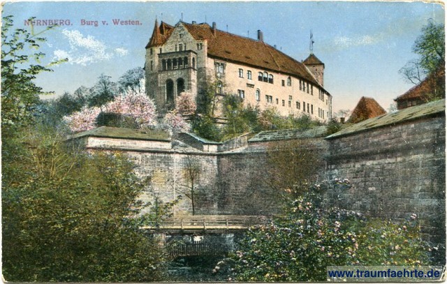 coloured – wall, bridge, wooden fence, Nuremberg castle from the West with tower in background