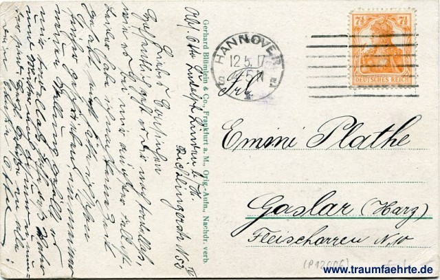 – Details – Jahr: ca. 1915 Status: gelaufen 1917 Beschriftung vorne: Hannover., Stadthalle. Beschriftung hinten: Gerhard Blümlein & Co., Frankfurt a. M., Orig.-Aufn., Nachdr. verb. Stempel: Hannover, S, 1, 12 5. 17 4-5N; --- Hinweis: