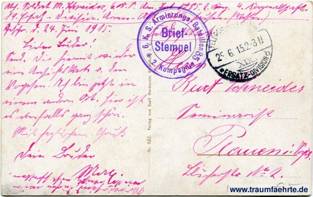 – Details – Jahr: ca. 1910 Status: gelaufen ohne Briefmarke (Feldpost), 1915 Beschriftung vorne: Schirmeck. Beschriftung hinten: Nr. 662. Verlag von Emil Hartmann, Strassburg i. E. Stempel: Feldpostexpedtition, XIX. Ersatz-Division, b, 25.6.15.2-3 N; Brief-Stempel 6. K.S. Armierungs-Bataillon 85, 2. Kompagnie Hinweis: