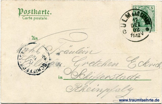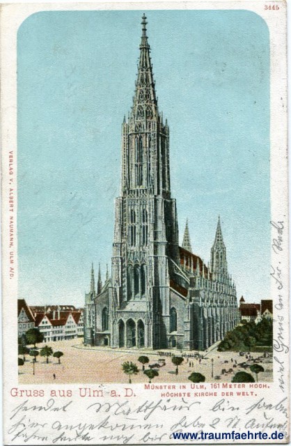 – Details – Jahr: ca. 1900 Status: gelaufen 1902 Beschriftung vorne: Gruss aus Ulm a. D. Münster in Ulm, 161 Meter hoch. Höchste Kirche der Welt. Verlag v. Albert Naumann, Ulm a/D. 3445 Beschriftung hinten: Postkarte. Carte postale. An ... in ... Stempel: Ulm a.[d.]D. Bahnhof, c, 12 Dez 02, 11-12V; Schifferstadt, 15 12 [...], Vor [...] Hinweis: