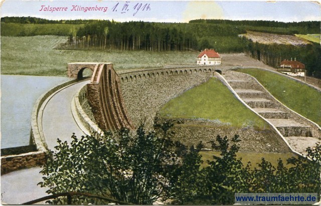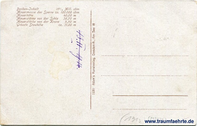 – Details – Year: ca. 1915 Postal state: postally unused Inscription front: Talsperre Klingenberg Inscription back: Becken-Inhalt 15½ Mill. Cbm, Mauermasse der Sperre ca. 120000 cbm, Mauerehöhe 30,00 m, Mauerstärke von der Sohle 36,70 m, Mauerstärke von der Krone 5,50 m, Grösste Stauhöhe ca. 31,00 m, 1130 Adam's Kunstverlag, Dresden-A., Am See 18 Postmark(s): none Please note: