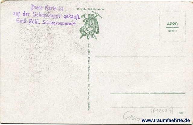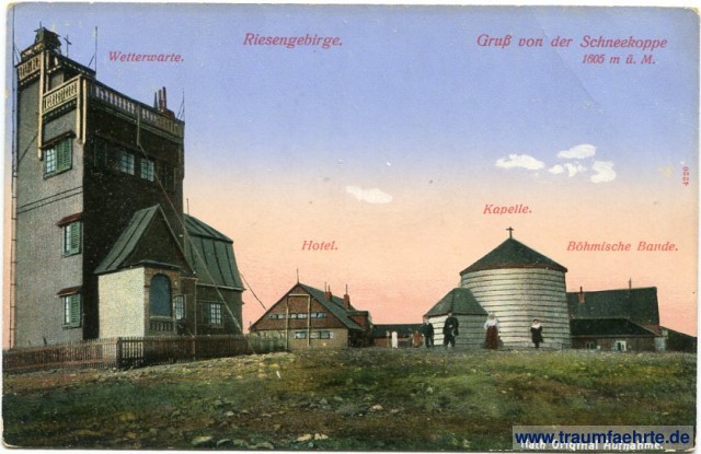 – Details – Year: ca. 1910 Postal state: postally unused Inscription front: Riesengebirge. Wetterwarte. Hotel. Kapelle. Böhmische Baude. Nach Original Aufnahme. Inscription back: Eingetr. Schutzmarke, No. 4220 Franz Pietschmann, Kunstverlag, Görlitz, 4220, (25574), XIII. Postmark(s): Diese Karte ist auf der Schneekoppe gekauft. Emil Pohl. Schneekoppenwirt. Please note: