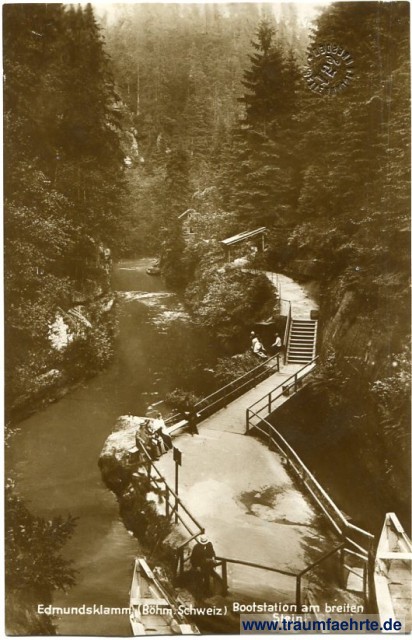 – Details – Jahr: ca. 1920 Status: ungelaufen Beschriftung vorne: Edmundsklamm (Böhm. Schweiz), Bootstation am breiten Stein Beschriftung hinten: Conrad Jacobi, Leipzig, 477 Stempel: [Relief] J. Bettenhausen Dresden, 15[...] Hinweis: