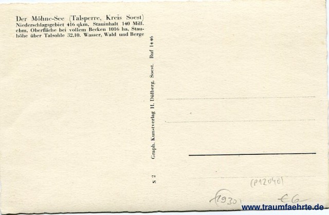 – Details – Jahr: ca. 1930 Status: ungelaufen Beschriftung vorne: Gruß vom Möhnesee, An der Sperrmauer, Delecker Brücke, Körbecker Brücke Beschriftung hinten: Der Möhne-See (Talsperre, Kreis Soest), Niederschlagsgebiet 416 qkm, Stauinhalt 140 Mill. Cbm, Oberfläche bei vollem Becken 1016 ha, Stauhöhe über Talsohle 32,10. Wasser, Wald und Berge, S 2 Graph. Kunstverlag H. Dülberg, Soest. Ruf 1446 Stempel: keine Hinweis: