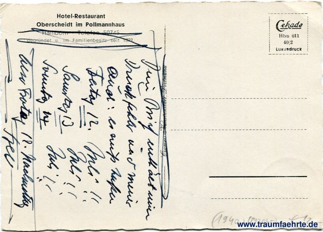 – Details – Year: ca. 1940 Postal state: postally unused Inscription front: Hotel Oberscheidt im Pollmannhaus, Hamborn Inscription back: Hotel-Restaurant Oberscheidt im Pollmannhaus, Hamborn, Telefon 50745, gegründet u. im Familienbesitz seit 1879, Cramers Kunstanstalt, Dortmund, Cekade, Hbn 011, 40|2, Luxusdruck Postmark(s): none Please note: