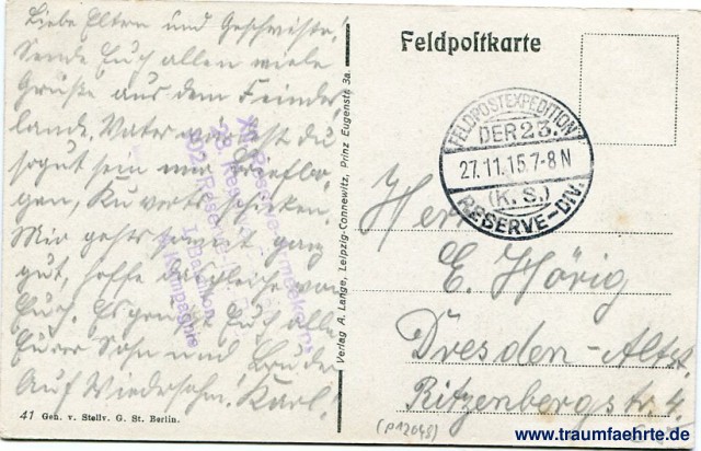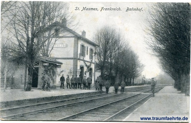 – Details – Year: ca. 1915 Postal state: postally used without stamp (military mail), 1915 Inscription front: St. Masmes, Frankreich. Bahnhof. Inscription back: Feldpostkarte, 41 Gen. v. Stellv. G. St. Berlin. Verlag A. Lange, Leipzig-Connewitz, Prinz Eugenstr. 3a Postmark(s): Feldpostexpedition der 23. Reserve-Div. (K.S.), 27.11.15.7-8N; XII. Reserve-Armeekorps, 23. Reserve-Inf.-Div., I. Bataillon, 4. Kompagnie Please note: