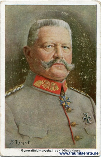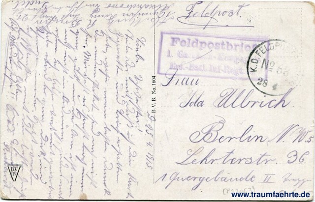 – Details – Year: ca. 1915 Postal state: postally used without stamp (military mail), 1915 Inscription front: Generalfeldmarschall von Hindenburg, S. Hornert. Inscription back: BV B, B. V. B. No. 1604 Postmark(s): K.D. Feldpoststation, No 68, 28 4; Feldpostbrief, 1. Ga[...]-Kompagnie, Ers.-Batl. Inf.-Regt. [24] Please note: