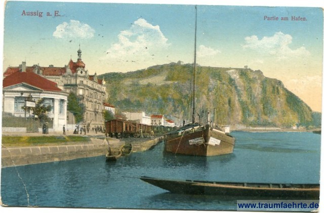 Postcard Port / Přístav in Ústí nad Labem / Aussig [ Permalink ]Keywords: Elbe / Labe River, Ships, Boats, Harbours, Trains, Mounts, Rocks, Forest, Bohemia, Sudetenland
