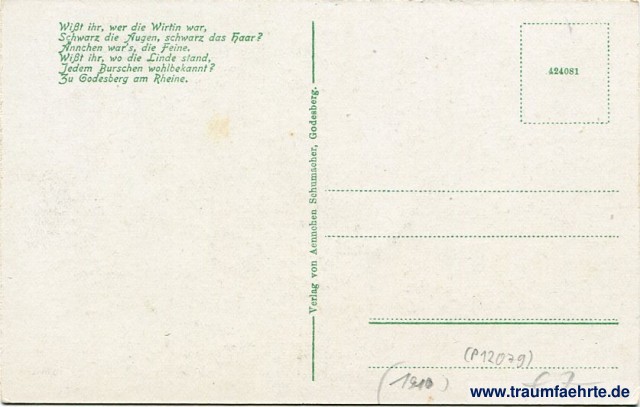 – Details – Jahr: ca. 1910 Status: ungelaufen Beschriftung vorne: Lindengarten 1872, Restauration von Schumacher. Restauration von Schumacher Beschriftung hinten: Wißt ihr, wer die Wirtin war, / Schwarz die Augen, schwarz das Haar? / Ännchen war's, die Feine. / Wißt ihr, wo die Linde stand, / Jedem Burschen wohlbekannt? / Zu Godesberg am Rheine. Verlag von Aennchen Schumacher, Godesberg. 424081 Stempel: keine Hinweis:
