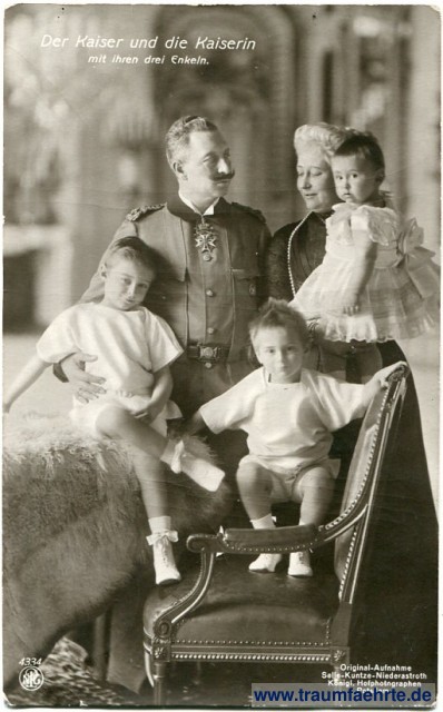 grey monochrome photograph – portrait of German Emperor Wilhelm II (German: Friedrich Wilhelm Viktor Albrecht von Preußen; English: Frederick William Victor Albert of Prussia), in uniform, Empress Augusta Victoria (German: Auguste Viktoria von Schleswig-Holstein-Sonderburg-Augustenburg, English: Augusta Victoria of Schleswig-Holstein), and three of their grandchildren
