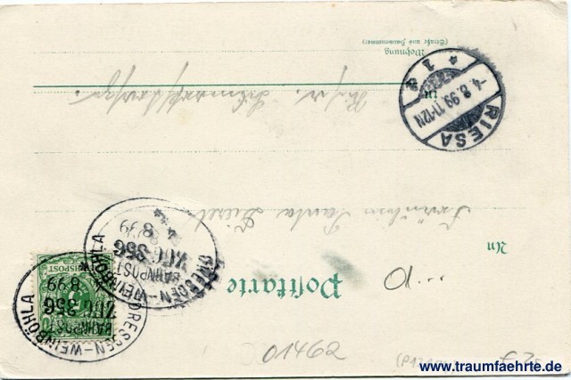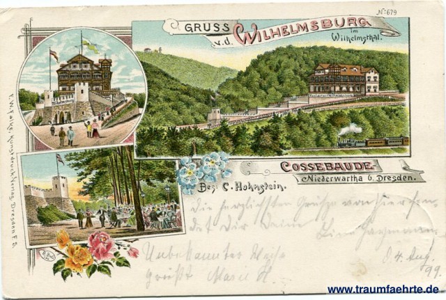 – Details – Jahr: ca. 1895 Status: gelaufen 1899 Beschriftung vorne: Gruss v. d. Wilhelmsburg im Wilhelmsthal. Cossebaude-Niederwartha b. Dresden. Bes: C. Hohnstein. F. W. Falke, Kunstdruck-Verlag, Dresden F. S. No. 679 Beschriftung hinten: Postkarte. An ... in ... Wohnung (Straße und Hausnummer) ... Stempel: 2x Dresden – Weinböhla, Bahnpost, Zug 356, 4 8 99, *; Riesa, * 1 a, -4. 8. 99. 11-12N Hinweis:
