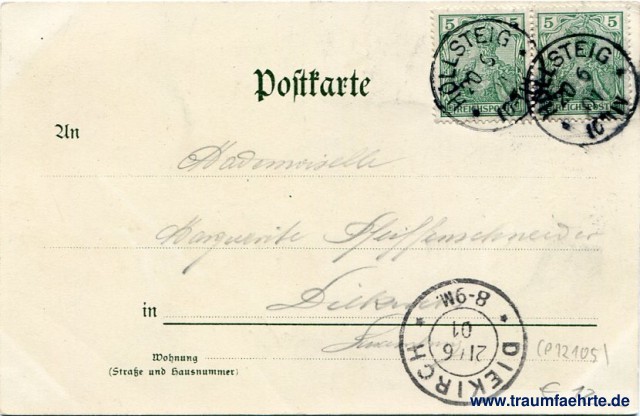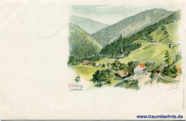 – Details – Jahr: ca. 1900 Status: gelaufen 1901 Beschriftung vorne: Höllsteig Sternen. [O].S. Künstlerpostkarte – Verlag v[.] August Imhof, Freiburg [i. B.] Beschriftung hinten: Postkarte. An ... in ... Wohnung (Straße und Hausnummer) ... Stempel: 2x Höllsteig, 20 6 01, 10-11V; Diekirch, 21/6 01, * 8-9M. * Hinweis: