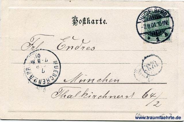 Postmark(s): Heidelberg, * 1 b, -7.9.01.10-11V.; Muenchen, 7 Sep 01, 7-8 m.
