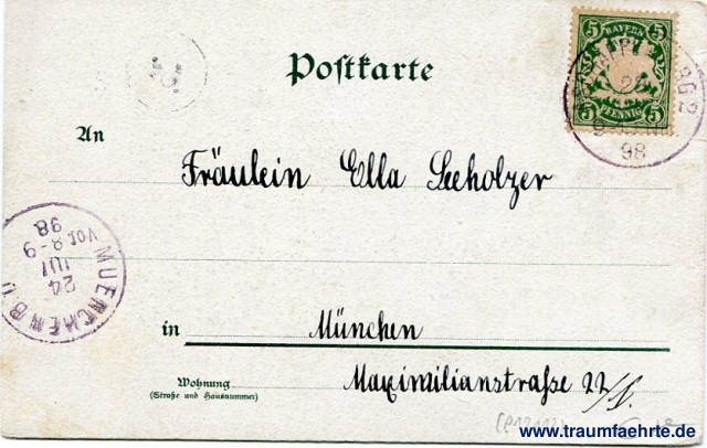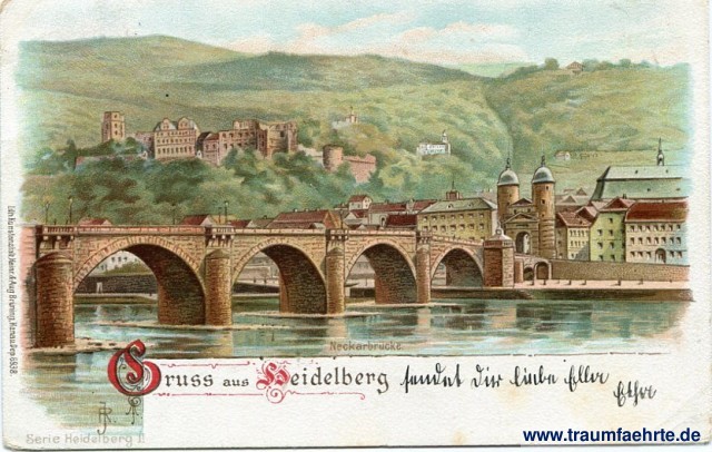 – Details – Jahr: ca. 1895 Status: gelaufen 1898 Beschriftung vorne: Gruss aus Heidelberg, Neckarbrücke. Serie Heidelberg II, RJ, Lith. Kunstanstalt, Heinr. & Aug. Brünning, Hanau. Dep. 6938. Beschriftung hinten: Postkarte. An ... in ... Wohnung (Straße und Hausnummer) ... Stempel: Aschaffenburg 2, 23 Jul 98, 9-10 Nm.; Muenchen [B. O.], 24 Jul 98, Vor. 8-9; ([2]6.) Hinweis: