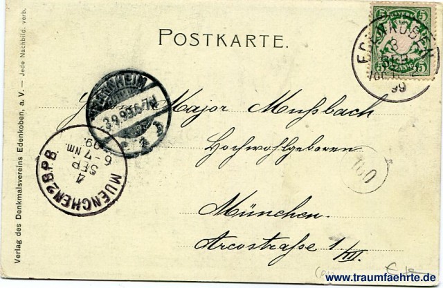 – Details – Year: ca. 1895 Postal state: postally used 1899 Inscription front: Sieges- u. Friedens-Denkmal bei Edenkoben, A. [Hork] Inscription back: Postkarte. Verlag des Denkmalsvereins Edenkoben, a. V. – Jede Nachbild. verb. Postmark(s): Edenkoben, 3 Sep 99, Vor. 11-12; Mannheim, [...], -3.9.99.6-7N.; Muenchen 2 B.P.B., 4 Sep 99. 6-7 Nm. Please note: