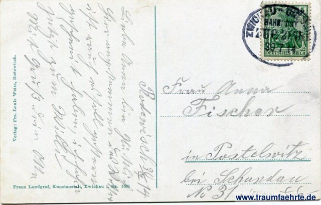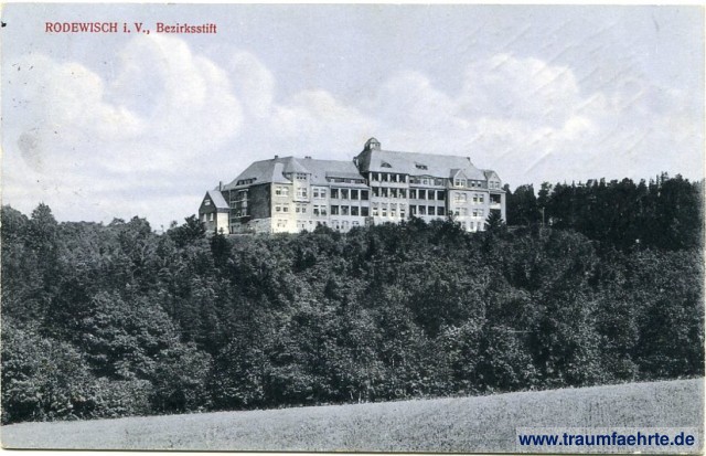 – Details – Jahr: ca. 1910 Status: gelaufen 1914 (Bahnpost) Beschriftung vorne: Rodewisch i. V., Bezirksstift Beschriftung hinten: Franz Landgraf, Kunstanstalt, Zwickau i. Sa. 1681, Verlag: Frz. Louis Weiss, Rodewisch. Stempel: Zwickau-[...], Bahnpost, Zug 2155, 30 7 14 Hinweis: