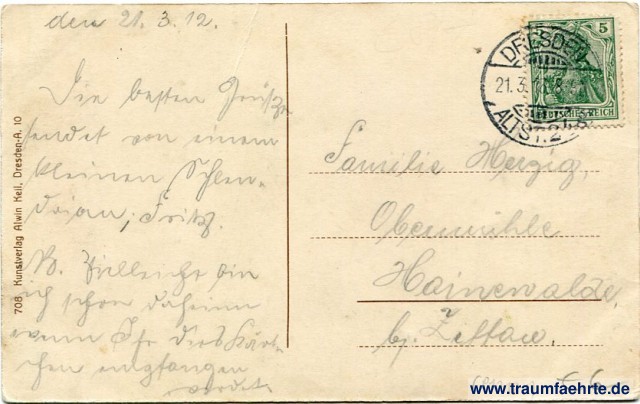 – Details – Jahr: ca. 1910 Status: gelaufen 1913 (datiert 1912) Beschriftung vorne: Rabenauer Grund – Wasserfall Beschriftung hinten: 708 Kunstverlag Alwin Keil, Dresden-A. 10 Stempel: Dresden-Altst. 2, [...]g, 21.3.13 8-9N Hinweis: