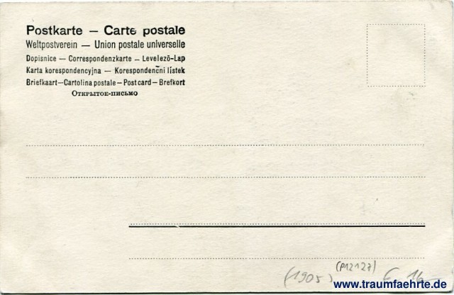 – Details – Jahr: ca. 1905 Status: ungelaufen Beschriftung vorne: Mathien, J., Frankreich. Verlag Th. Wolschke, Berlin C 2. Beschriftung hinten: Postkarte – Carte postale, Weltpostverein – Union postale universelle, Dopisnice – Correspondenzkarte – Levelezö-Lap, Karte korespondencyjna – Korespondencni listek, Briefkaart – Cartolina postale – Post card – Brefkort, Открытое письмо Stempel: keine Hinweis: