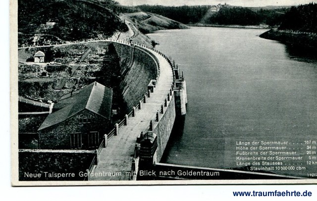– Details – Year: ca. 1940 Postal state: postally unused Inscription front: Neue Talsperre Goldentraum mit Blick nach Goldentraum, Länge der Sperrmauer ... 167 m, Höhe der Sperrmauer ... 34 m, Fußbreite der Sperrmauer ... 26 m, Kronenbreite der Sperrmauer 5km, Länge des Stausees ... 12 km, Stauinhalt 10 500 000 cbm, 242CC Inscription back: Im schönen Queistal, F. Schierz, Görlitz, Langenstraße 12 Postmark(s): none Please note: