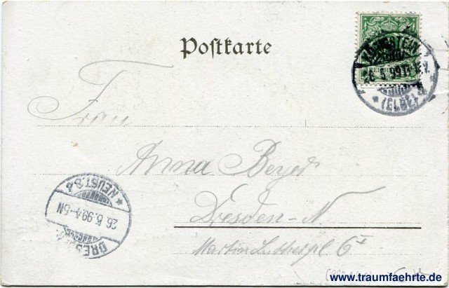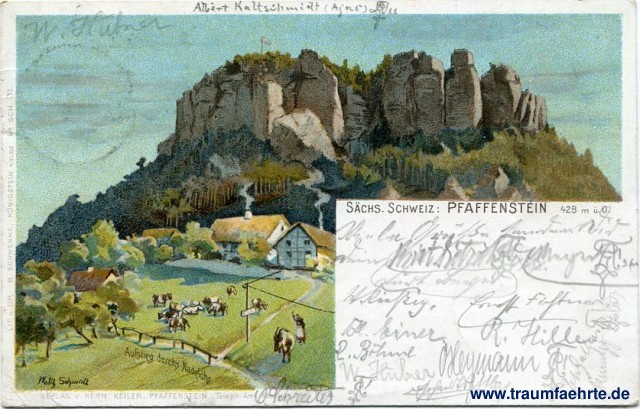 – Details – Jahr: ca. 1895 Status: gelaufen 1899 Beschriftung vorne: Sächs. Schweiz: Pfaffenstein, 428 m ü. 0. Aufsteig durchs Nadelöhr. W[...] Schmidt, Verlag v. Herm. Keiler, Pfaffenstein. Teleph. Amt Königstein a/E. No. 18 Beschriftung hinten: Postkarte Stempel: Königstein (Elbe), * a, 26.5.99 [11-12] V.; Dres[den] Neust. 8, * b, 26.5.99.4-5N Hinweis: