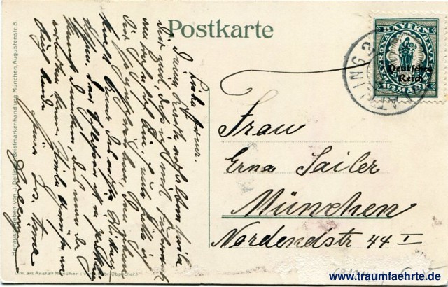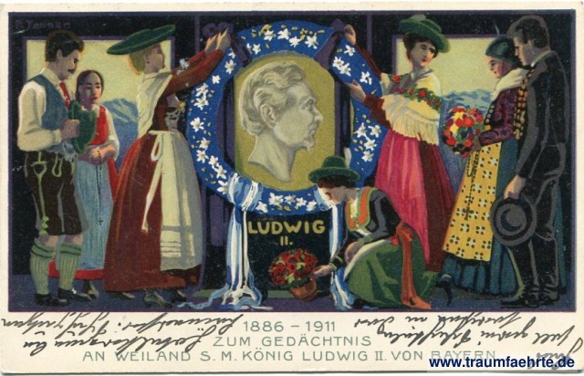 – Details – Jahr: ca. 1915 Status: gelaufen Beschriftung vorne: 1886 – 1911, Zum Gedächtnis an Weiland S.M. König Ludwig II. von Bayern. Ludwig II. Beschriftung hinten: Postkarte, Herausgegeben von J. Dollinger, Briefmarkenhandlung, München, Augustenstr. 8. Lith.art. Anstalt München (vor[m]. Gebr. Obpacher.) Stempel: Plat[t]ling, [...] Hinweis: