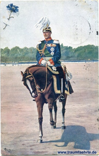 farbig – Blaue Kornblume, Portrait von König Friedrich August III. (Sachsen), mit vollem Namen Prinz Friedrich August Johann Ludwig Karl Gustav Gregor Philipp von Sachsen , in Uniform auf Pferd