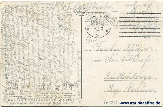 – Details – Jahr: ca. 1910 Status: gelaufen ohne Briefmarke (Feldpost), 1915 Beschriftung vorne: kein Text Beschriftung hinten: Stengel, Unsere Heerführer im Westen, v. Kluck. Albr. v. Württemberg. D. Elsa. Wichura. v. Heeringen. v. Bülow. v. Einem. Ruppr. v. Bayern. Wilhelm II. v. Falkenhayn. Kronpr. Wilhelm. I E Stempel: Bautzen, * 2 *, 14 10 15, 1-2 N Hinweis: