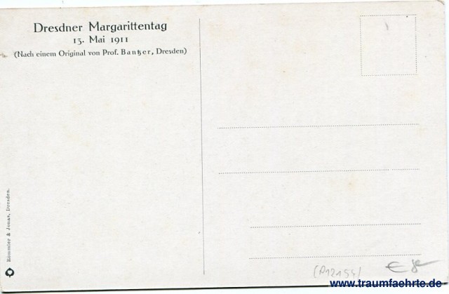– Details – Year: 1911 Postal state: postally unused Inscription front: C. Bantzer Inscription back: Dresdner Margarittentag, 13. Mai 1911 (Nach einem Original von Prof. Bantzer, Dresden), Römmler & Jonas, Dresden. Postmark(s): none Please note: