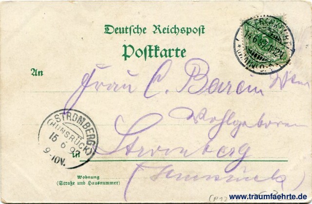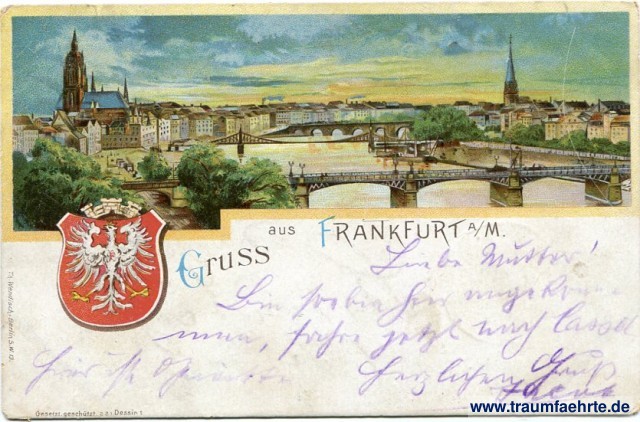 – Details – Jahr: ca. 1895 Status: gelaufen 1897 Beschriftung vorne: Gruss aus Frankfurtr a/ M. Beschriftung hinten: Deutsche Reichspost, Postkarte, An ... in ..., Wohnung ... (Straße und Hausnummer) Stempel: Frankfurt (Main), [...], 14.6.97. 11-12V; Stromberg (Hunsrück), 15 6 97, 9-10N. Hinweis: