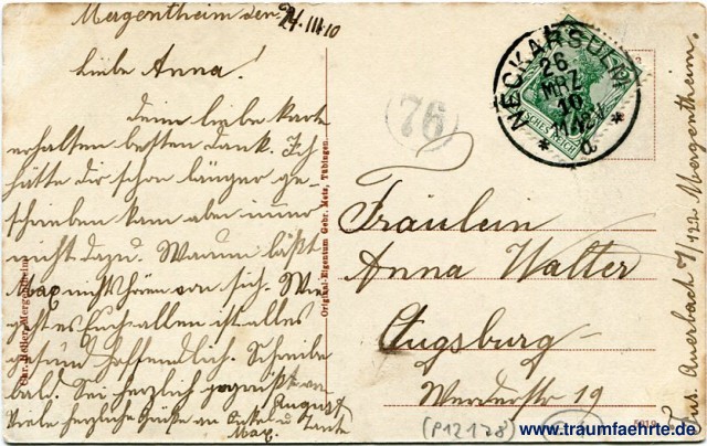 – Details – Jahr: ca. 1905 Status: gelaufen 1910 Beschriftung vorne: Bad Mergentheim Beschriftung hinten: Original-Eigentum Gebr. Metz, Tübingen. 5919 Stempel: Neckarsulm, 26 Mrz 10, 11-12V, a; (76) Hinweis: