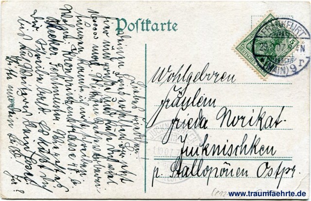 Stempel: Frankfurt (Main), 9 r, 29.9.07.3-4N.; Jucknischken [...], – 1.10.07.7-8V.
