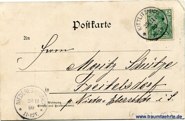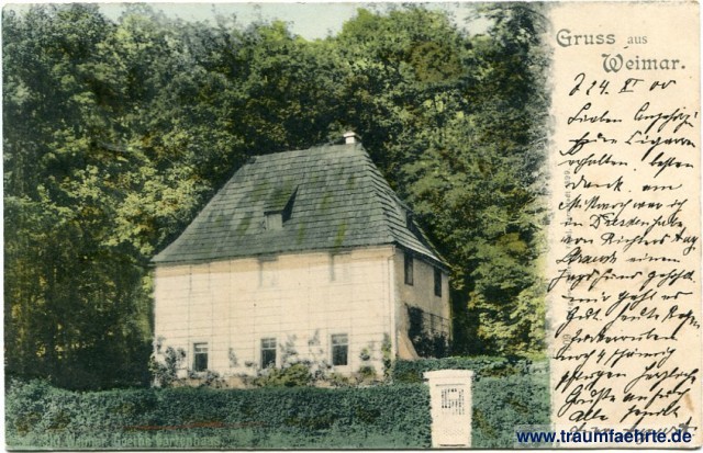 – Details – Jahr: 1899 Status: gelaufen 1900 Beschriftung vorne: Gruss aus Weimar. 310. Weimar. Goethe Gartenhaus. 509 Verlag von Zedier & Vogel, Darmstadt 1899. Beschriftung hinten: Postkarte, An ... in ... Wohnung (Straße und Hausnummer) ... Stempel: Kittlitz i/ Sachs., 25|11 00 6-7V; Niederebersbach, 20 11 00 11-12V. Hinweis: