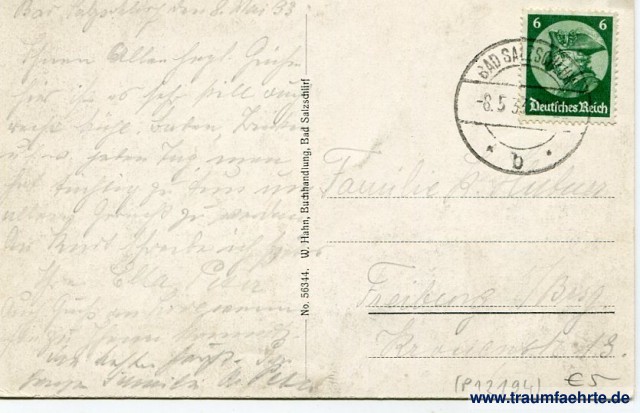 – Details – Jahr: ca. 1930 Status: gelaufen 1933 Beschriftung vorne: Bad Salzschlirf. Am Bonifaziusbrunnen. Beschriftung hinten: No. 56344. W. Hahn, Buchhandlung, Bad Salzschlirf Stempel: Bad Salzschlirf, * b *, -8.5.33 21-22 Hinweis: