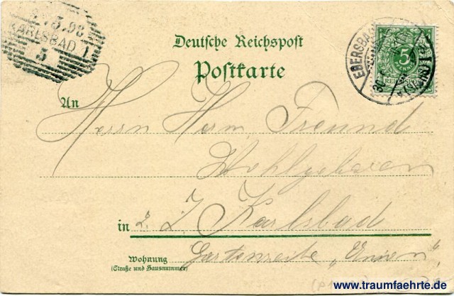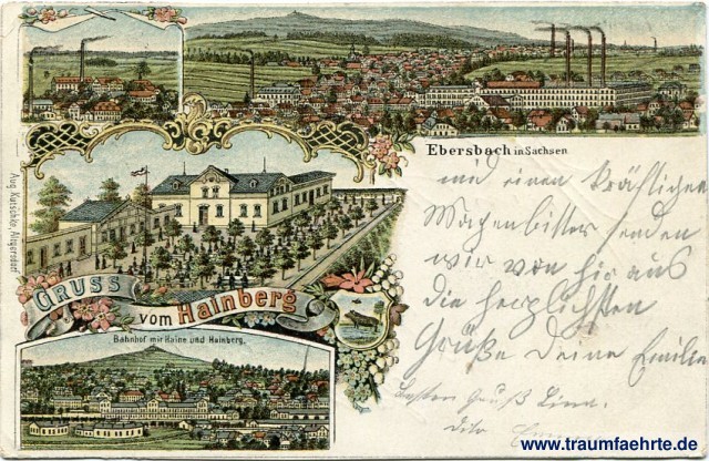 – Details – Jahr: ca. 1895 Status: gelaufen 1898 Beschriftung vorne: Gruss vom Hainberg, Ebersbach in Sachsen, Bahnhof mit Haine und Hainberg. Aug. Kutschke, Altgersdorf Beschriftung hinten: Deutsche Reichspost, Postkarte, An ... in ... Wohnung (Straße und Hausnummer) ... Stempel: Ebersbach (Sachs.), a, 30.5.[98 1]0-11V.; 3[...].5.90, Karlsbad [1], 5 Hinweis: