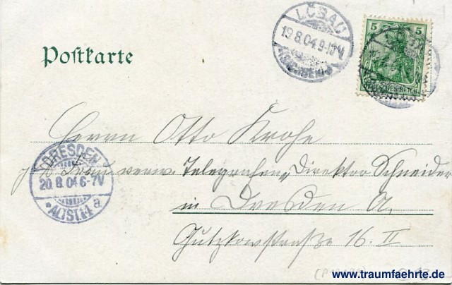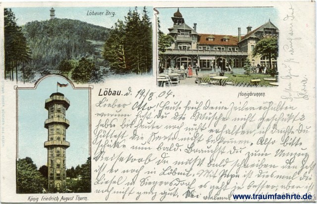 – Details – Jahr: ca. 1900 Status: gelaufen 1904 Beschriftung vorne: Löbau. Löbauer Berg. Honigbrunnen. König Friedrich August Thurm. Beschriftung hinten: Postkarte Stempel: 2x Löbau (Sachsen), 19.8.04.9-10[N]; Dresden-Altst. 14, a, 20.8.04 6-7V Hinweis: