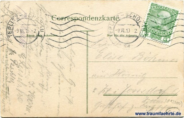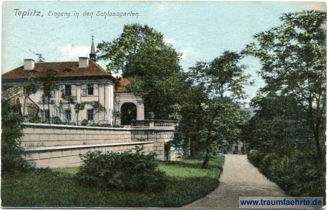 – Details – Jahr: ca. 1905 Status: gelaufen 1910 Beschriftung vorne: Teplitz, Eingang in den Schlossgarten. Beschriftung hinten: Correspondenzkarte. Raum zum schreiben. Nur für die Adresse. Heliocolorkarte von Ottmar Zieher, München. Stempel: 2x Teplitz-Schönau, 5d, -9.VI.10 2; ~~~ Hinweis: