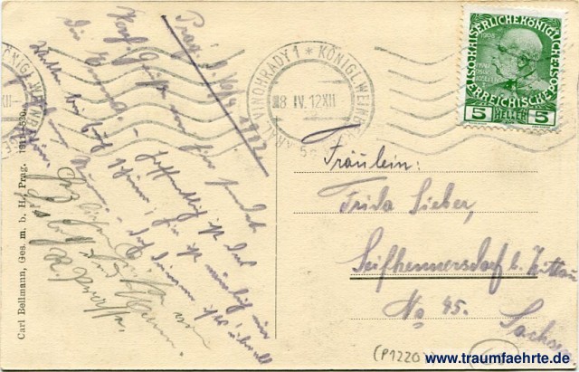 – Details – Jahr: 1911 Status: gelaufen 1912 Beschriftung vorne: Prag, Franz Josefs-Bahnhof. Beschriftung hinten: Carl Bellmann, Ges. m. b. H., Prag. 1911-530. Stempel: 1½x Královské Vinohrady 1, Königliche Weinberge, 5c, 8.IV.12XII; ~~~ Hinweis: