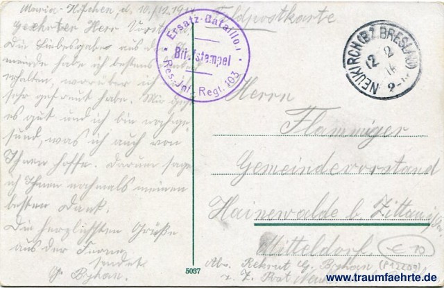 – Details – Jahr: ca. 1910 Status: gelaufen ohne Briefmarke (Feldpost), 1914 Beschriftung vorne: Breslau, Hauptbahnhof Beschriftung hinten: 5037 Stempel: Briefstempel, Ersatz-Bataillon, Res.-Inf.-Regt. 103; Neukirch (Bz Breslau), 12 2 14, 2-[...] Hinweis:
