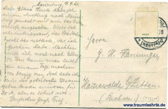 – Details – Jahr: ca. 1920 Status: gelaufen 1921, Briefmarke entfernt Beschriftung vorne: Marienburg, Westpr. Westseite. Beschriftung hinten: Verlag Ferdinand Preuss, Marienburg, Wpr. SHGE Stempel: [...] (Westpr.), [...] Hinweis: