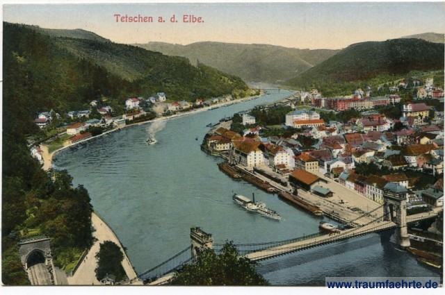 Ansichtskarte Panorama Tetschen / Děčín in Tetschen-Bodenbach / Děčín [ Permalink ]Schlagworte: Elbe, Brücken, Schiffe, Dampfschiffe, Tunnel, Schienen, Panorama, Böhmen, Böhmische Schweiz, Sudetenland