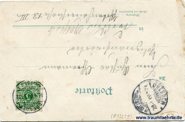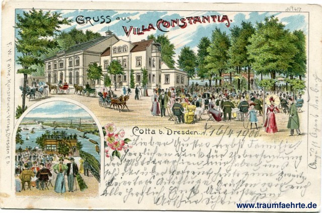 – Details – Jahr: ca. 1895 Status: gelaufen 1900 Beschriftung vorne: Gruss aus Villa Constantia. Cotta b. Dresden. No. 417. F. W. Falke, Kunstdruck-Verlag Dresden F 5. Beschriftung hinten: Postkarte, An ... in ... Wohnung (Straße und Hausnummer) ... Stempel: Dresden-Altst. [...], 16.4.00.8-10N; Dresden-Altst. [16 a], [...].00 [5]-6V. Hinweis: